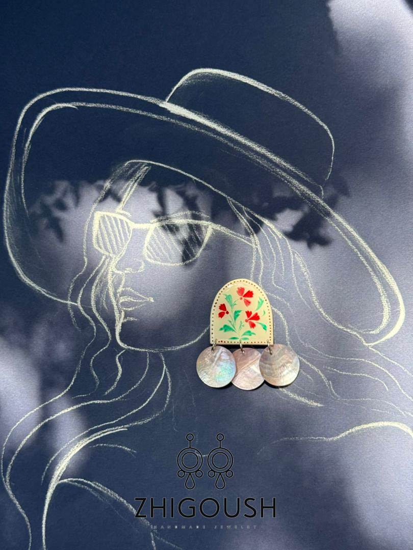 گوشواره خمیری دستساز-نقاشی شده-با پوشش رزین و قطعات استیل ضد حساسیت- با آویزهای صدف طبیعی صورتی-بسیار سبک