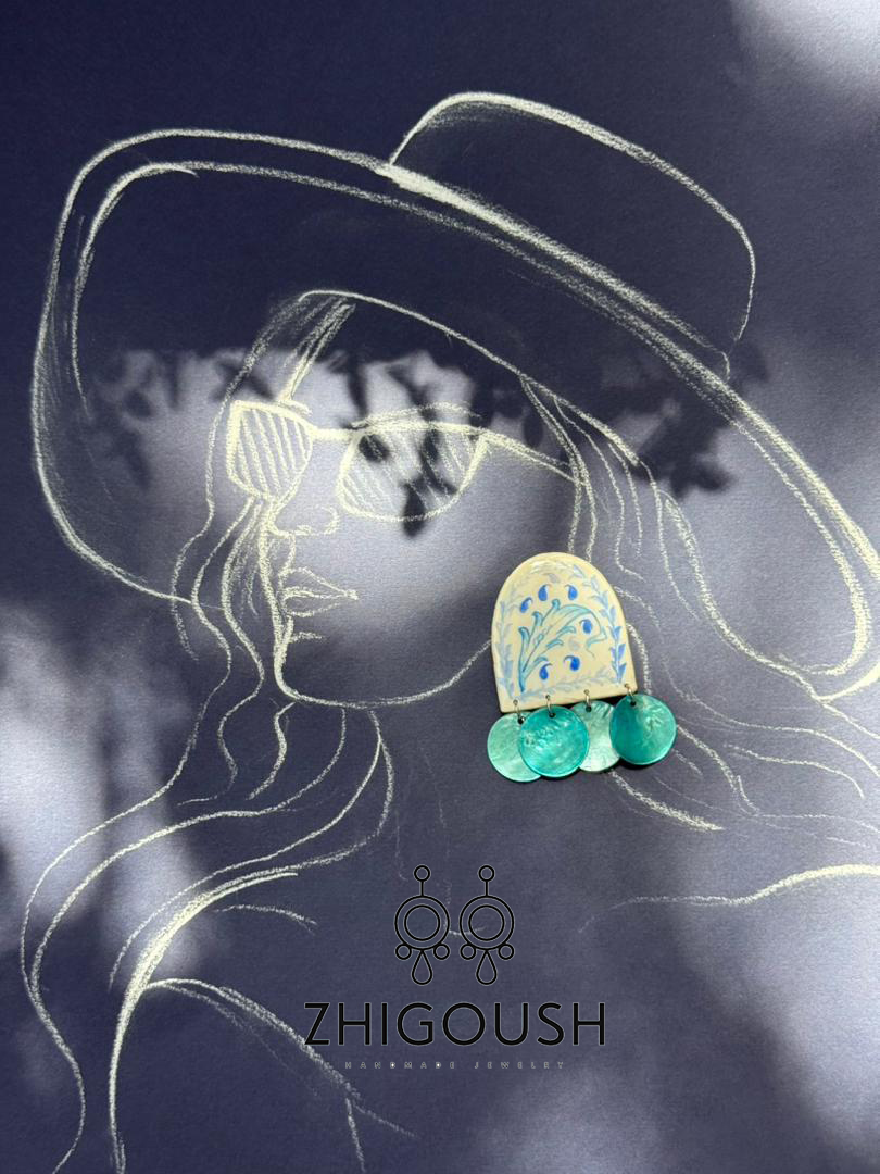 گوشواره خمیری دستساز-نقاشی شده با پوشش رزین همراه با صدف های طبیعی آبی-با قطعات استیل ضد حساسیت-بسیار سبک