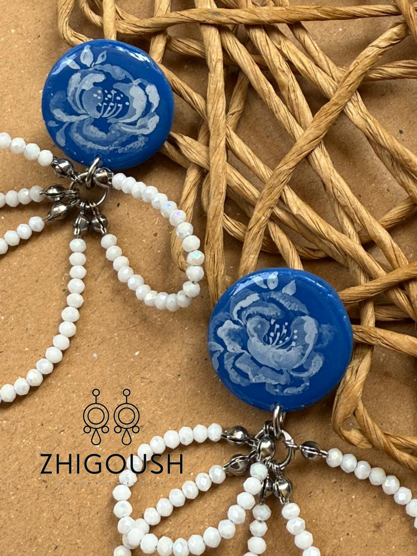 گوشواره خمیری دستساز-نقاشی شده با پوشش رزین و کریستالهای سفید-با قطعات استیل ضد حساسیت-بسیار سبک
