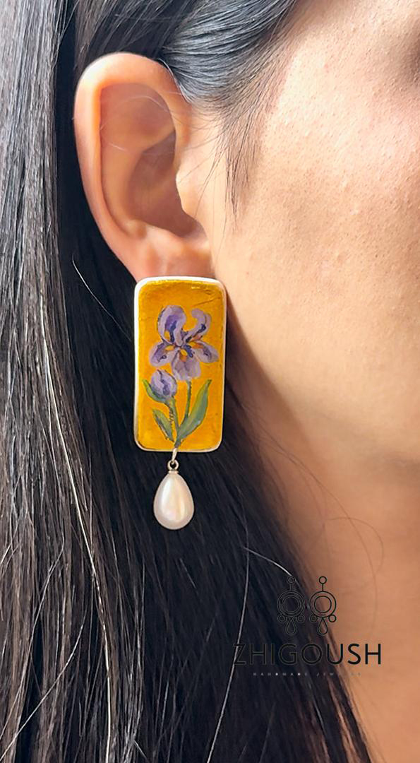 گوشواره خمیری دستساز-نقاشی شده روی ورق طلا و تکنیک لاکی روغنی و پوشش رزین-با قطعات استیل ضد حساسیت-آویز مروارید-بسیار سبک