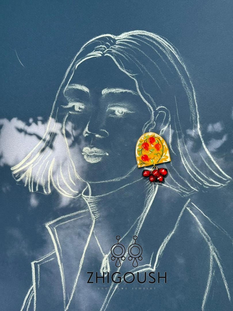 گوشواره خمیری دستساز-نقاشی شده با پوشش رزین-با قطعات استیل ضد حساسیت- با آویزهای دونه اناری-بسیار سبک