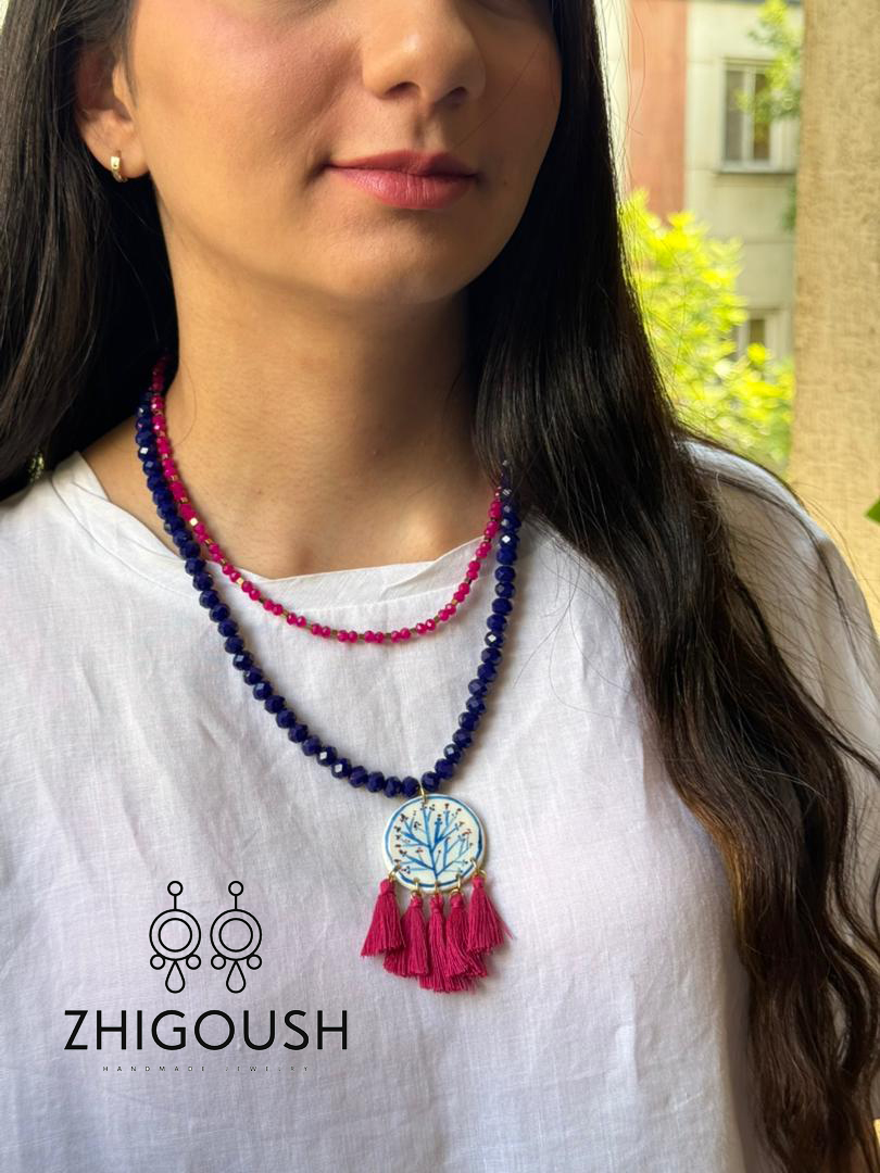 دستهبندی: گردنبندبرچسبها : uniquejewelryزیورآلات_دستسازاکسسوریهنر_دستژیگوشhandmadeرنگ: سرخابی-سرمه ای