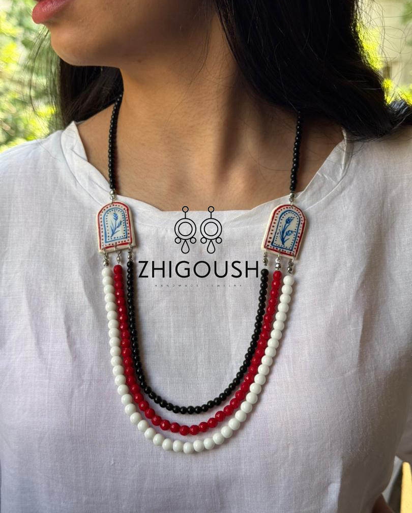 گردنبند ویدا، نقاشی شده، ساخته شده از خمیر دست ساز و مهره های رنگی - با پوشش رزین، اتصالات تماما استیل ضد حساسیت