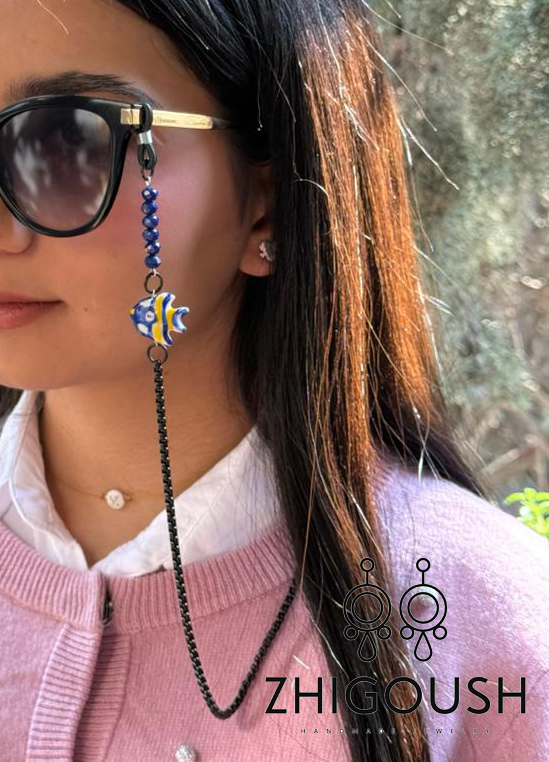 بند عینک سرامیکی ژیگوش، با مهره های مشکی و سرامیک ماهی،زنجیر مشکی